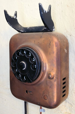 W 28 als Wandgerät mit Metallgehäuse, einer gusseiserner Gabel und Bakelithörer. Zunächst von Siemes & Halke in einer Vorserie als "fg.tist.66.a.v." gebaut. Ab 1928, nach Zulassung durch die Deutsche Reichspost, wurde das W 28, als Tisch und Wandapparat, von nahezu allen deutschen Herstellern in Lizenz gebaut, Es war das Standardgerät der 20/30er Jahre. Anfänglich noch mit Lüftungsschlitzen, die später weggelassen wurden. Sie dienten der besseren Hörbarkeit der Klingel. Im Volksmund wurde das Wandgerät wegen der großen Gabel "Hirsch" genannt. Im Original war der abgebildete App. schwarz. Der Vorbesitzer hat es in einem Kupferton übermalt.
