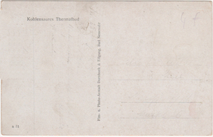 Karte im Querformat und SW-Druck Das Bild ist in Grautönen erstellt. Hinter einer Wiese vor zwei Bäumen ein langgstrecktes Gebäude. Rechts zwischen zwei Gebäuden eine überdachte Öffnung. In Bildmitte hinter dem langgestreckten Gebäude ragt ein dreigeschossiges Gebäude "Kurhaus - St. Josephsrudel" heraus. Im weiteren Hintergrund Wand. Vorderseite: Unten rechts Bodendorf/Ahr - Kur- und Badehaus Rückseite: Oben rechts Kohlensaures Thermalbad; unten rechts a 31. Auf der Rückseite ist links ober die Wertangabe 4 f und rechts in senkrechter Richtung schwach ein Text in Schreibschrift erkennbar und links im Adressenfeld schwach der Empfänder der Karte sichtbar. In der Mitte senkrecht steht "Film- u. Photo-Anstalt Dornbach & Elfgang, Bad Neuenahr