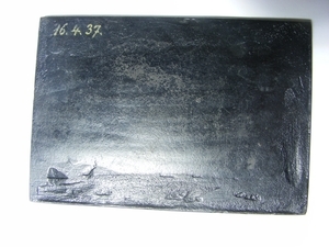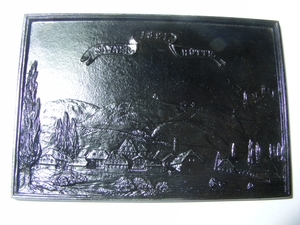 Eisenguss; lakiert; Relief; Querformat; Originalguss der Sayner Hütte; Sayner Neujahrsplakette 1821 mit Darstellung der Königlich-Preußischen Eisengießerei in Sayn und im Hintergrund den Ausläufern des Westerwaldes. Leihgabe: Familiengesellschaft Burg Grenzau.