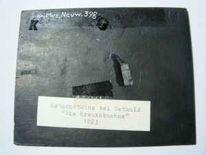 Eisenguss; geschwärzt; Relief; Querformat; Originalguss der Sayner Hütte; Drahtaufhänger auf der Rückseite; Sayner Neujahrsplakette 1823 mit Darstellung der sog. Externsteine bei Detmold auf der Vorderseite (VS). Es handelt sich hierbei um ein Felsenbild mit einem Relief der Kreuzabnahme Christi. Unter dem Kreuz rechts wird die germanische Irminsäule gebrochen. Der Entwurf stammt von dem Berliner Künstler Christian Daniel Rauch. Auf der Rückseite oben links ist der Buchstabe "K" erhaben mitgegossen. Modell: vermutlich Heinrich Zumpft . Leihgabe: Röntgen Museum Neuwied, ehemals Kreismuseum Neuwied (Inv.-Nr. 398)
