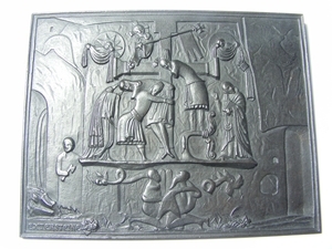 Eisenguss; geschwärzt; Relief; Querformat; Originalguss der Sayner Hütte; Drahtaufhänger auf der Rückseite; Sayner Neujahrsplakette 1823 mit Darstellung der sog. Externsteine bei Detmold auf der Vorderseite (VS). Es handelt sich hierbei um ein Felsenbild mit einem Relief der Kreuzabnahme Christi. Unter dem Kreuz rechts wird die germanische Irminsäule gebrochen. Der Entwurf stammt von dem Berliner Künstler Christian Daniel Rauch. Auf der Rückseite oben links ist der Buchstabe "K" erhaben mitgegossen. Modell: vermutlich Heinrich Zumpft . Leihgabe: Röntgen Museum Neuwied, ehemals Kreismuseum Neuwied (Inv.-Nr. 398)