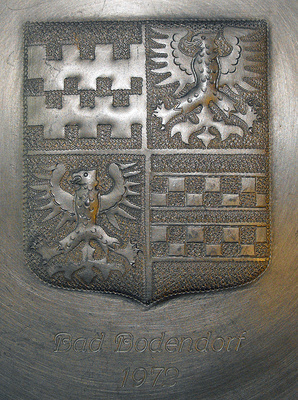 Wappenteller aus Zinn mit erhabenem Dorfwappen, Details sind besonders herausgearbeitet, und dem Schriftzug "Bad Bodendorf 1972". Der Teller zeigt leichte Gebrauchsspuren, Die Rückseitig angelötete Aufhängung ist abgebrochen. Der Teller wurde in einer limitierten Auflage anlässlich der Verleihung des Bad-Titels herausgehen.