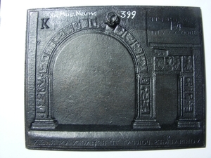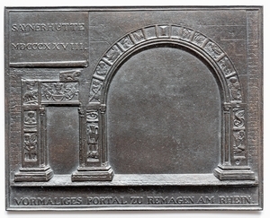 Eisenguss; geschwärzt; Relief; Querformat; Originalguss der Sayner Hütte 1827 mit Drahtaufhänger auf der Rückseite; Diese Neujahrskarte- bzw. Plakette hergestellt für das Neujahr 1828 zeigt als Motiv das Portal zu Remagen am Rhein. Auf der Vorderseite ist die Plakette oben links beschriftet mit "SAYNERHÜTTE / MDCCCDXXVIII" und am unteren Rand mit "VORMALIGES PORTAL ZU REMAGEN AM RHEIN". Dem ersten Entwurf hatte man auf der Sayner Hütte eigenmächtig einen Wanderer mit Landschaft hinzugefügt, was von den vorgesetzten Dienststellen abgelehnt wurde. Daraufhin musste die Sayner Hütte ein neues, bereinigtes Modell für den Guss der Neujahrsplakette anfertigen. Auf der Hütte existierte nach wie vor ein Modell mit romantischer Landschaft und Wanderer, wovon wohl Abgüsse für den offenen Verkauf erstellt wurden. Ein solches Zinnmodell mit Zierrahmen gehört zum Bestand des Rheinischen Eisenkunstguss-Museums und ist ausgestellt (vgl. Inventar-Nr. 4.013). Entwurf: Bernhard Hundshagen, Bonn. Modell: Heinrich Zumpft, Sayn. Leihgabe: Röntgen Museum Neuwied, vormals Kreismuseum Neuwied (Inv.-Nr. 399).