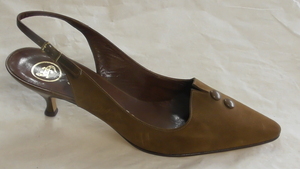 Ein einzelner Pumps aus schwarzem Kunstleder. Spitze Form, mit Kunstleder bezogener und metallgenagelter Pfennigabsatz (ca. 5,5cm). Der Schuh verfügt über ein Zierband mit einem Zierknopf aus Kunststoff. Damengröße 5,5. Hergestellt von der Firma Salamander in Kornwestheim (D). Leider sehr ungenau datiert.