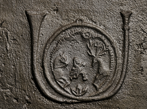 Darstellung des hl. Hubertus und Hirsch mit Kranz im Geweih innerhalb einer medaillonartigen Rahmung in Form eines Jagdhorns. Rokokoelemente in den Ecken der Platte. Südeifel (Weilerbach?)
