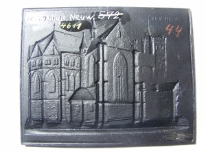Eisenguss; geschwärzt; Relief; Querformat; Originalguss der Sayner Hütte 1830; Die anlässlich des Neujahrstages 1831 gegossene Plakette zeigt die Ansicht der Kirche zu Münstermaifeld von Südosten. Die ehemalige Stiftskirche mit Doppelpatrozinium St. Martin und St. Severus ist eine dreischiffige Basilika zu drei Jochen mit einem ausladenden Querhaus, einem reich gegliederten Dreiapsidenchor im Osten und einer mächtigen Turmgruppe im Westen, an die im Süden eine Vorhalle angebaut ist. Die massive Westturmgruppe stammt aus der Zeit um 1136 und war dem ottonischen Vorgängerbau vorgelagert. In der ersten Hälfte des 13. Jahrhunderts entstand das polygonale Chorhaupt mit seiner Etagengliederung und einer aus zwei Doppelarkaden pro Seite gebildeten Zwerggalerie. Das kurze Langhaus entstand ab 1250. Die Plakette ist auf der Vorderseite am unteren Rand beschriftet mit "KIRCHE ZU MÜNSTERMAYFELD". Auf der Rückseite ist spiegelverkehrt nur schwer die Beschriftung "MDCCCXXXI SAYNERHÜTTE" zu erkennen. Entwurf: Georg Osterwald (Bruder des Modelleurs Carl Osterwald). Modell: Heinrich Zumpft, Sayn. Leihgabe: Röntgen Museum Neuwied (Inv.-Nr. 4611).