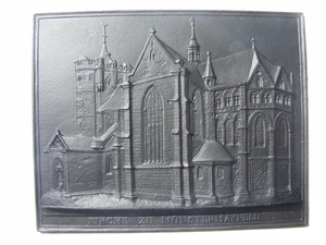 Eisenguss; geschwärzt; Relief; Querformat; Originalguss der Sayner Hütte 1830; Die anlässlich des Neujahrstages 1831 gegossene Plakette zeigt die Ansicht der Kirche zu Münstermaifeld von Südosten. Die ehemalige Stiftskirche mit Doppelpatrozinium St. Martin und St. Severus ist eine dreischiffige Basilika zu drei Jochen mit einem ausladenden Querhaus, einem reich gegliederten Dreiapsidenchor im Osten und einer mächtigen Turmgruppe im Westen, an die im Süden eine Vorhalle angebaut ist. Die massive Westturmgruppe stammt aus der Zeit um 1136 und war dem ottonischen Vorgängerbau vorgelagert. In der ersten Hälfte des 13. Jahrhunderts entstand das polygonale Chorhaupt mit seiner Etagengliederung und einer aus zwei Doppelarkaden pro Seite gebildeten Zwerggalerie. Das kurze Langhaus entstand ab 1250. Die Plakette ist auf der Vorderseite am unteren Rand beschriftet mit "KIRCHE ZU MÜNSTERMAYFELD". Auf der Rückseite ist spiegelverkehrt nur schwer die Beschriftung "MDCCCXXXI SAYNERHÜTTE" zu erkennen. Entwurf: Georg Osterwald (Bruder des Modelleurs Carl Osterwald). Modell: Heinrich Zumpft, Sayn. Leihgabe: Röntgen Museum Neuwied (Inv.-Nr. 4611).