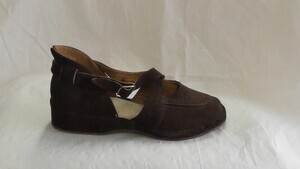 Ein einzelner Pumps aus schwarzem Veloursleder. Spitze Form, mit Veloursleder bezogener und metallgenagelter Absatz (ca. 6,5cm), ein Knöchelriemen mit Schnalle dient der Befestigung. Der Schuh verfügt über eine Zehenöffnung. Hergestellt von der Firma Salamander in Kornwestheim (D). Leider sehr ungenau datiert.