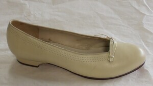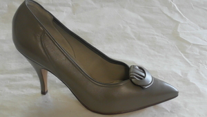 Ein einzelner Pumps aus türkisfarbenem Kunstleder. Spitze Form, mit Kunstleder bezogener und metallgenagelter Pfennigabsatz (ca. 6,5cm). Der Schuh verfügt über eine Zierschleife aus Kunstleder. Hergestellt von der Firma Salamander in Kornwestheim (D). Leider sehr ungenau datiert.