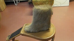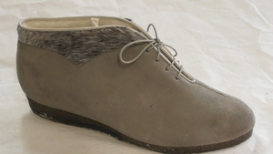 Ein einzelner Damenhalbschuh aus schwarzem Fell. Die zum Fell zugehörige Tierart lässt sich nicht eindeutig feststellen. Das Fell ist sehr grob und rauh. Spitze Form, Absatz (ca. 2,5cm), Lochschnürung mit Lasche am Einstieg. Das Innenfutter des Schuhs besteht aus Wolle. Hergestellt von der Firma Salamander in Kornwestheim (D). Leider sehr ungenau datiert.