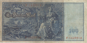 Graublaue Banknote mit großem Bild einer König mit Schwert und preußischem Staatswappen auf Schild. Links im Bild Amboss und darüber drei Dampfschiffe auf der Vorderseite. Auf der Rückseite zwei Bilder im Jugendstil. In Scheinmitte ein Rechteck mit den Daten des Herausgebers.