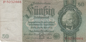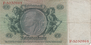 Banknote mit grünem Druck mit Portrait David Hansemann auf der Vorderseite und Daten des Herausgebers. Auf der Rückseite neben Jugendstilkopf mit Helm im Kreis links und rechts je eine Pute.