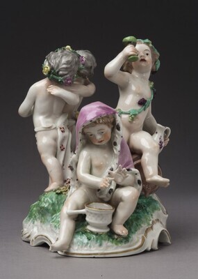Bemalte Vierfigurengruppe der "Vier Jahreszeiten". Sie stehen auf einem hochgewölbten, ringförmig gestützten Rosensockel mit Goldranken. Die vier Jahreszeiten sind in Gestalt von vier Putti: der Frühling mit Blumenkranz und der Sommer mit Garben in den Händen umarmen sich. Traubenranken schlingen sich um Kopf und Oberkörper des Herbsts, der in der Rechten einen weingefüllten Römer und in der Linken einen Krug hält. Der Herbst sitzt auf einem Fass. Der Winter sitzt als einziger der vier Jahreszeiten auf dem grasbewachsenen Sockel. Vor ihm steht ein kleines Kohlebecken über das er sich wärmend die Hände hält. Ein rosa Mantel mit Hermelinpelzfutter bedeckt Schultern und Kopf.