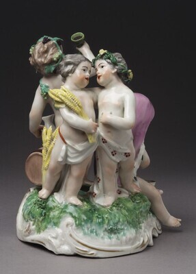 Bemalte Vierfigurengruppe der "Vier Jahreszeiten". Sie stehen auf einem hochgewölbten, ringförmig gestützten Rosensockel mit Goldranken. Die vier Jahreszeiten sind in Gestalt von vier Putti: der Frühling mit Blumenkranz und der Sommer mit Garben in den Händen umarmen sich. Traubenranken schlingen sich um Kopf und Oberkörper des Herbsts, der in der Rechten einen weingefüllten Römer und in der Linken einen Krug hält. Der Herbst sitzt auf einem Fass. Der Winter sitzt als einziger der vier Jahreszeiten auf dem grasbewachsenen Sockel. Vor ihm steht ein kleines Kohlebecken über das er sich wärmend die Hände hält. Ein rosa Mantel mit Hermelinpelzfutter bedeckt Schultern und Kopf.
