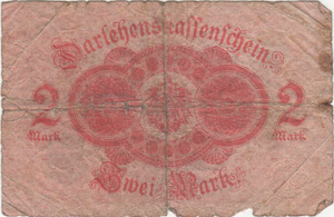 Schein in sehr schlechtem Zustand. Die untere rechte Ecke ist abgerissen und der Schein in der Mitte eingerissen. Auf der Vorderseite in Brauntönen bedruckt. Oben links und rechts zwei behelmte Köpf in der Mitte in Bodenschrift "Darlehnskassenschein" und darunter der Wert als Wort. Unten links und rechts die Wertangabe als Zahl. Auf der Rückseite auf grafisch gestaltetem Untergrund mit Rahmen oben "Darlehnskassenschein", darunter die Wertangabe als Wort und darunter der Herausgeben mit Herausgabedatum.