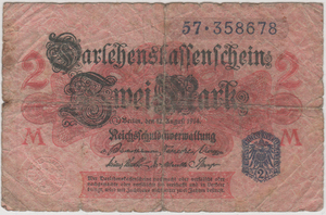 Schein in schlechtem Zustand. Der Mitte stark geknickt und leicht eingerissen. Auf der Vorderseite im Rotton eine Rosette und die Wertangabe als Zahl gedruckt. In Schwarz ist die Scheinnummer, Das Wort "Darlehnskassenschein" und die Wertangabe als Zahl gedruckt. Darunter die Daten des Herausgebers und das Herausgabedatum. Auf der Rückseite eine Rosette, wie auf der Vorderseite, links und rechts daneben die Wertangabe als Zahl und über der Rosette das Wort "Darlehnskassenschein" und unter der Rosette die Wertangabe als Wort gedruckt.
