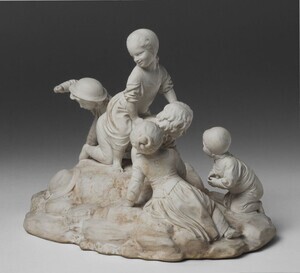 Felssockel mit spielenden Kindern. In der Mitte ein, auf einem Knaben reitendes Mädchen. Links davon ein sich bückender Knabe mit Hut, der den krabbelten Knaben antreibt. Rechts daneben in knieender und halbliegender Position zwei Mädchen die den Spielenden zuschauen. Im Vordergrund liegt ein Hut auf dem Sockel. Das Modell ist von Johann Peter Melchior.