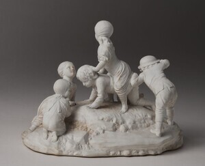 Felssockel mit spielenden Kindern. In der Mitte ein, auf einem Knaben reitendes Mädchen. Links davon ein sich bückender Knabe mit Hut, der den krabbelten Knaben antreibt. Rechts daneben in knieender und halbliegender Position zwei Mädchen die den Spielenden zuschauen. Im Vordergrund liegt ein Hut auf dem Sockel. Das Modell ist von Johann Peter Melchior.