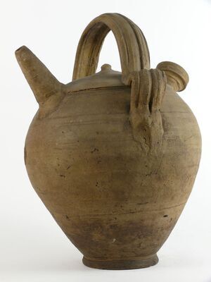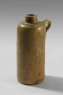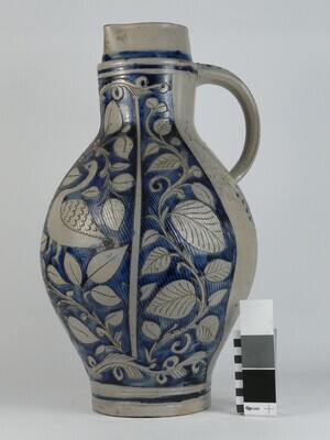 Der Krug ist aus Steingut, mit eierschalenfarbener Glasur und großem verziertem Henkel. Oben und unten zieren profilierte farbige Ornamentleisten wie Eierstab und Strichreihung den Krug. In der Mittelzone ist eine bildliche Szene mit einer Allegorie der Lebensfreude zu sehen. Rechts und links davon ein Eichenlaub- und Mispelzweig mit Spruchbändern. Der Spruch beginnt links mit "Wer nicht liebt und trinkt und singt" und geht rechts weiter mit "Es nie zu wahrer Freude bringt". Dazu sind Attribute der Lebensfreude wie Laute, Notenbuch, Weinglas, Weintraube, Köcher und rotes Herz abgebildet. Auf der Unterseite ist ein rundes Ritzzeichen mit den Buchstaben: M&W, G. Der Zinndeckel ist seitlich am Henkel befestigt und ornamentverziert. Eine Inschrift lautet: "Franz Weber .. Fideliu, Neujahr 1899". Auf der Innenseite ist eine runde, kleine Zinnmarke.