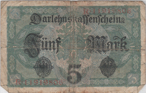 Grau-blauer Druck für den in einem Rahmen eingefassten grafischen Feld. Auf der Vorderseite sind links der Kaiseradler und rechte ein Frauenkopf in einem ovalen Rahmen gedruckt. Im linken Scheinbereich in einem hellen Rechteck der Wert in Worten, der Herausgeben und das Herausgabedatum gedruckt.Der Wert als Zahl ist sechs mal gedruckt. Auf der Rückseite grüner Druck in einem Rahmen eingefassten grafischen Feld mit Angaben, wie Darlehnskassenschein, Wert in Worten und als Zahl und in Rot die Scheinnummer.
