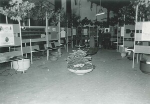 Farbfotografie. Diese Aufnahme vom 11. Oktober 1977 zeigt einen Blick vom Kirchturm der Medarduskirche über Bendorf in Richtung Mühlenstraße. Das Backsteingebäude in der Bildmitte ist die ehemalige Medardus Grundschule. Heute befindet sich in diesem Gebäude die Kindertagesstätte "Haus des Kindes".