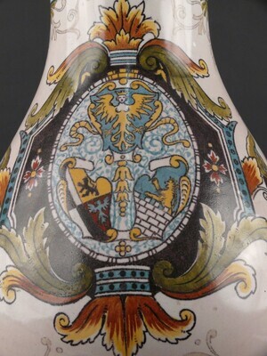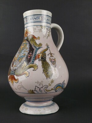 Henkelkrug weißgrundig und bunt glasiert, innen weiß glasiert. Ornamente und Wappenkartusche. Am Hals umlaufende Inschrift: München - Nürnberg - Kulmbach - Erlangen. Marke: V&B - M. (Villeroy & Boch, Mettlach).