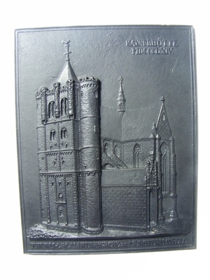 Eisenguss; geschwärzt; Relief; Hochformat; Originalguss der Sayner Hütte 1863; Die anlässlich des Neujahrs 1864 von der Sayner Hütte herausgegebene Plakette zeigt eine Ansicht der ehemaligen Stiftskirche St. Martin und St. Severus in Münstermaifeld in der Eifel von Südwesten. Es handelt sich bei der Kirche um eine dreischiffige Basilika zu drei Jochen mit einem ausladenden Querhaus, einem reich gegliederten Dreiapsidenchor im Osten und einer mächtigen Turmgruppe im Westen, an die im Süden eine Vorhalle angebaut ist. Seit der Säkularisation wird die Kirche als Pfarrkirche genutzt. Auf der Vorderseite oben ist die Plakette beschriftet mit "SAYNERHÜTTE / MDCCCLXIV" und unten "THURM D. ST. MARTINSKIRCHE ZU MÜNSTERMAYFELD". Modelleur: Wilhelm Samuel Weigelt. Leihgabe: Röntgen Museum Neuwied (Inv.-Nr. 4633).