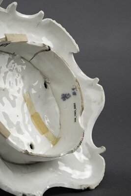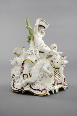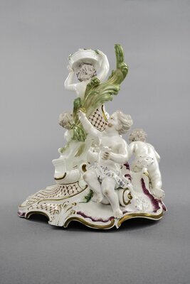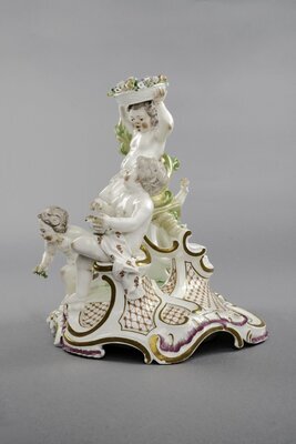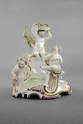 Durchbrochenes Rocaillegehäuse auf Rocaille-Sockel. Zwei Putti sitzen auf unterschiedlicher Höhe auf der Rocailleverzierung. Beide halten mit Blumen gefüllte Körbe in den Händen. Ein Putto ist in nach vorne gebeugter Läuferhaltung dargestellt. Der vierte sitzt mit dem Rücken zu den anderen drei und hält eine Blume in der nach oben hin ausgestreckten Hand. Die Putti sind farbig bemalt, der Sockel mit rot und Gold geschmückt. Blaumarke CT mit Krone und AB 6. AB steht für Adam Bergdoll, der von 1762-1770 in der Porzellanmanufaktur Frankenthal tätig war.