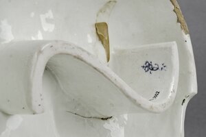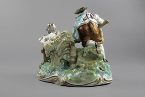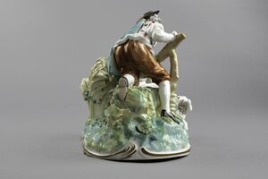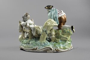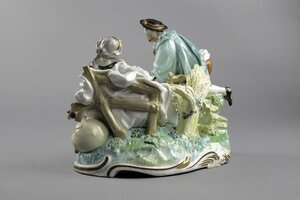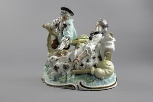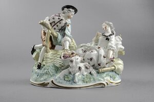 Schäferszene. Eine juge Schäferin sitzt zurückgelehnt, scheinbar eingeschlafen auf einer Bank auf einer durch grüne Farbe angedeuteten Wiese. Neben ihr auf dem Boden liegt ein Hund der den Kopf zur Schäferin hin gewandt hat. Hinter der Bank ragt ein großer, gelber Dudelsack hervor. In der linken Hand hält die Schäferin einen kleinen Blumenstrauß. Gekleidet ist sie in ein weißes, weites Kleid mit roten und purpurfarbenen Streublumen darauf. Um den Hals ist ein schwarzes Tuch geschlungen und zusammengebunden. Links klettert ein junger Mann über einen Zaun und greift nach einem mit Rosen gefüllten Korb. Die Hosen des Mannes sind orange, sein Überwurf grün, sein Hemd weiß mit purpurnen Streifen und Blüten. Zwischen den beiden Figuren sind mit Blumengirlanden umrankte Weizenähren. Die Figuren sind auf einem ovalen Sockel mit Rocaille--Rahmung. Blaumarke CT mit Krone und 75.