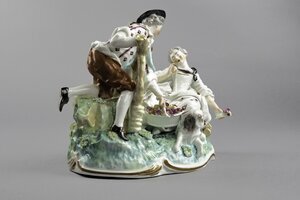Schäferszene. Eine juge Schäferin sitzt zurückgelehnt, scheinbar eingeschlafen auf einer Bank auf einer durch grüne Farbe angedeuteten Wiese. Neben ihr auf dem Boden liegt ein Hund der den Kopf zur Schäferin hin gewandt hat. Hinter der Bank ragt ein großer, gelber Dudelsack hervor. In der linken Hand hält die Schäferin einen kleinen Blumenstrauß. Gekleidet ist sie in ein weißes, weites Kleid mit roten und purpurfarbenen Streublumen darauf. Um den Hals ist ein schwarzes Tuch geschlungen und zusammengebunden. Links klettert ein junger Mann über einen Zaun und greift nach einem mit Rosen gefüllten Korb. Die Hosen des Mannes sind orange, sein Überwurf grün, sein Hemd weiß mit purpurnen Streifen und Blüten. Zwischen den beiden Figuren sind mit Blumengirlanden umrankte Weizenähren. Die Figuren sind auf einem ovalen Sockel mit Rocaille--Rahmung. Blaumarke CT mit Krone und 75.