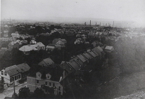 Schwarzweißfotografie. Dieses Bild aufgenommen im Jahr 1924 zeigt einen Blick über die Stadt Bendorf am Rhein. Am rechten Bildrand ist der Kirchturm der Medarduskirche zu erkennen und dahinter die rauchenden Schornsteine der Concordia-Hütte in Mülhofen. Auf der linken Seite im Hintergrund sind die Engerser Eisenbahnbrücke sowie davor die Schornsteine der Mülhofener Hütte sichtbar.