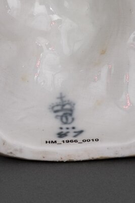 Unregelmäßig gebildeter Sockel als Felsplatte mit Grasnarbe in grau und grün. Auf einer stark gefältelten Decke, deren Unterseite gelb und die Oberseite weiß mit roten Blüten ist, liegen drei Putti. Vom Betrachter aus gesehen liegt der Putto links schlafend auf dem Bauch. Der in der Mitte liegt auf dem Rücken. Dieser lächelt dem dritten, hinter bzw. neben ihm sitzenden zu, der ihm eine violette Weintraube hinhält. Fleischtöne der nackten Putti weiß, etwas rosa gehöht, Haare hellgrau. Im Inneren des hohlen Sockels CT-Marke, darunter 3 Punkte, darunter 87, alles in blau.