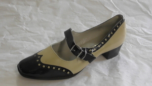 Ein einzelner Pumps aus schwarzem Lackleder und Leder. Spitze Form, lederbezogener und metallgenagelter Absatz (ca. 3,5cm). Der Schuh verfügt über drei Zierbänder aus Lackleder und ist mit Zierlochungen versehen. Hergestellt von der Firma Salamander in Kornwestheim (D). Leider sehr ungenau datiert.