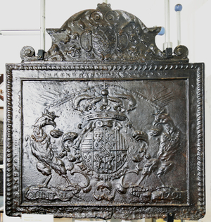 Takenplatte mit dem Motiv des Königlichen Wappens Frankreichs. Das Wappen umgeben von 2 Delphinen mit den Köpfen nach unten. Aus ihren Schwänzen sprießen Lilien. Lothringen, datiert 1706