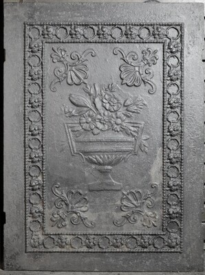 Ofenplatte mit dem Motiv der Justitia, darüber ein Ritterhelm und Rankenwerk. Rechts ist eine Verlängerungsplatte mit nicht mehr erkennbarem Motiv angesetzt,