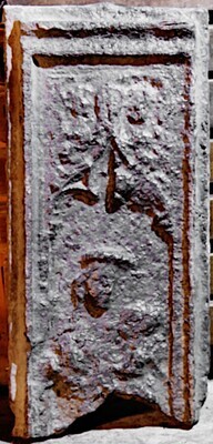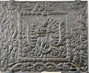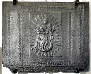 Takenplatte oder Kaminplatte mit dem Motiv der Luxemburger Madonna. Dargestellt ist Maria mit Kind, Zepter, Schlüssel und hoher Krone. Von dieser fällt ein Schleier als Brautsymbol bis zum Boden hinab. Über der Maria halten Putten eine Spangenkrone über das gekrönte Haupt der Maria. Es handelt sich um ein sehr beliebtes Plattenmotiv von dem mehrere Abgüsse erhalten sind. Das Model ist 100 Jahre in Gebrauch gewesen, da datierbare Abgüsse von 1708 bis 1803 erhalten sind. Unsere Platte ist eher von der spartanischen Natur. Vergleichbare Platten mit dem identischen Hauptmotiv besitzen oft Jahreszahlen, Spruchbänder und/oder ornamentale Zierelemente. Das Bild auf der Takenplatte hat auf den ersten Blick recht wenig Ähnlichkeit mit der in der Luxemburger Kathedrale stehenden Madonna. Dies erklärt sich daraus, dass diese Madonna über Jahrhunderte stets in kostbare Kleider gehüllt war und so auch unter anderem auf unserer Takenplatte abgebildet ist. Erst im Rahmen der letzten Renovierung 2008 wurde der Madonna die Gewänder wieder ausgezogen und sie ist nun in der farblich originalen Fassung wieder auf einer Mondsichel stehend zu sehen. Aufgrund der sehr aufwändigen Gestaltung dieser Figur ist auch davon auszugehen, dass vom Schnitzer und seinem Auftraggeber nicht geplant war diese zu verhüllen. Auf dem Wikipediaartikel "Muttergottesoktav" ist je ein Foto vom aktuellen Zustand und von der letzten Verhüllung als Gewandfigur zu sehen.