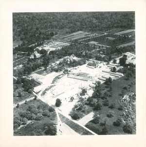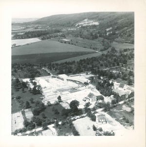 Schwarzweißfotografie als Postkarte mit der Aufschrift "Sommerfrische Sayn; Holler's Hotel Friedrichsberg" am unteren Bildrand gedruckt. Diese Aufnahme aus dem Jahr 1942 zeigt den ehemaligen Gasthof "Holler's Hotel Friedrichsberg", gelegen am Ritterweg in Bendorf-Sayn. Noch heute befindet sich an jener Stelle eine Hotelpension, der sogenannte "Waldgasthof Friedrichsberg".