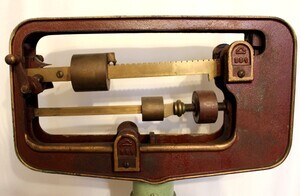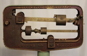 Personenwaage der Firma Garvens, vorwiegend medizinischer Gebrauch. Skaleneinteilung zur Gewichtsbestimmung nur auf einer Seite, sodass die gewogene Person ihr Gewicht nicht ablesen kann, sondern nur der Untersucher.