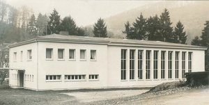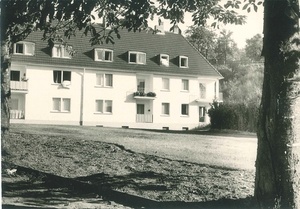 Schwarzweißfotografie. Diese Luftaufnahme zeigt im Vordergrund neu angepflanzte Obstplantagen, in der Bildmitte Bims- bzw. Schwemmsteinproduktion und im Hintergrund neu errichtete Wohnhäuser auf dem Friedrichsberg in Bendorf-Sayn.
