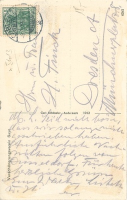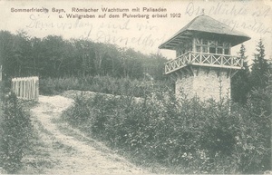Schwarzweißfotografie als Postkarte gedruckt und mit der Aufschrift am oberen Bildrand "Sommerfrische Sayn, Römischer Wachturm mit Palisaden u. Wallgraben auf dem Pulverberg erbaut 1912". Der Betrachter steht unterhalb des sog. Römerturms und blickt von unten auf Turm (rechts) und Palisade (links). Diese Postkarte aus dem Jahr 1913 zeigt den im Jahr 1912 vom Verschönerungsverein Sayn erbauten Römerturm auf dem Pulverberg im Bendorfer Stadtwald. Es handelt sich dabei um eine Rekonstruktion eines römischen Wachtturms am Obergermanisch-Rätischen Limes mit Palisade, Wall und Graben. Die Originalfundamente des Wachturmes liegen zirka 20 Meter neben der in den Jahren 2009/10 aufwändig restaurierten Rekonstruktion. 1911/1912 hatten durch den Archäologen und Professor Georg Loeschke aus Bonn auf dem Pulverberg in Sayn Ausgrabungen am römischen Grenzwall (Limes )stattgefunden (vergleiche auch Inv.-Nr. 7.2222-7.2224). Nach den Ausgrabungen errichtete der Verschönerungsverein Sayn auf Anregung Loeschkes einen Aussichtsturm, die Rekonstruktion eines römischen Wachtturms. Beim Abbau von Bims Ende des 19. und Anfang des 20. Jahrhunderts sowie beim Bau der Bundesstraße 42 in den 1970er Jahren stieß man auf römische Kastellanlagen in Holz-Erde-Konstruktion, ein Kastellbad und einen Vicus (römerzeitliche Siedlung) in unmittelbarer Rheinnähe. Heute befindet sich an dieser Stelle die sog. Kastell-Siedlung und die Auffahrt Bendorf-Nord der Bundesstraße 42. Der Limes zog sich von Sayn im Nordwesten durch den Bendorfer Stadtwald unterhalb der Nauorter Hochfläche in Richtung Höhr-Grenzhausen. Im Bendorfer Stadtwald ist der Verlauf des römischen Grenzwalls Limes mit Wall und Graben sowie vorhandene Schutthügel der Wachttürme heute noch gut zu erkennen.