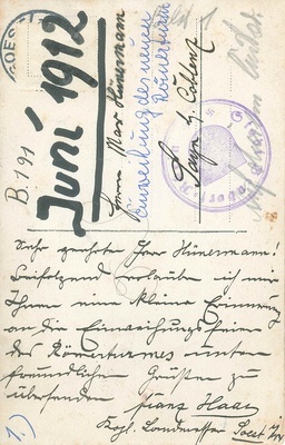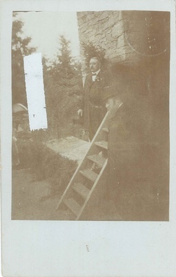 Schwarzweißfotografie. Diese Aufnahme entstand Ende Juni 1912, und zeigt den Vorsitzenden des Verschönerungsvereins Sayn, Max Hünermann (Direktor der Brauerei Hünermann in Sayn), während seiner Ansprache zur Einweihung des sog. Römerturms auf dem Pulverberg in Sayn. Es handelt sich dabei um die Rekonstruktion eines römischen Wachtturms am Obergermanisch-Rätischen Limes mit Palisade, Wall und Graben. Die Originalfundamente des Wachturmes liegen zirka 20 Meter neben der in den Jahren 2009/10 aufwändig restaurierten Rekonstruktion. 1911/1912 hatten durch den Archäologen und Professor Georg Loeschke aus Bonn auf dem Pulverberg in Sayn Ausgrabungen am römischen Grenzwall (Limes )stattgefunden (vergleiche auch Inv.-Nr. 7.2222-7.2224). Nach den Ausgrabungen errichtete der Verschönerungsverein Sayn auf Anregung Loeschkes einen Aussichtsturm, in Gestalt eines römischen Wachtturms. Im Jahre 1913 errichtete der Verschönerungsverein zum Gedenken an Professor Georg Loeschke unterhalb des Römerturms in den Fels gemauert eine "Schutzhütte", die sog. "Loeschcke-Ruhe".
