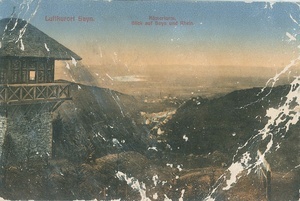 Kolorierte Schwarzweißfotografie als Postkarte gedruckt mit der Aufschrift am oberen Bildrand "Luftkurort Sayn. Römerturm. Blick auf Sayn und Rhein". Diese Aufnahme zeigt den im Jahre 1912 vom Verschönerungsverein Sayn erbauten sog. Römerturm. 1911/1912 hatten durch den Archäologen und Professor Georg Loeschke aus Bonn auf dem Pulverberg in Sayn Ausgrabungen am römischen Grenzwall Limes stattgefunden (vergleiche auch Inv.-Nr. 7.2222-7.2224, 7.2228). Nach den Ausgrabungen errichtete der Verschönerungsverein Sayn auf Anregung Loeschkes einen Aussichtsturm. Es handelt sich hierbei um die Rekonstruktion eines römischen Wachtturms am Obergermanisch-Rätischen Limes. Bei der Ausbeute von Bims Ende des 19. und Anfang des 20. Jahrhunderts sowie beim Bau der Bundesstraße 42 in den 1970er Jahren stieß man auf römische Kastellanlagen in Holz-Erde-Konstruktion, ein Kastellbad und einen Vicus (römerzeitliche Siedlung) in unmittelbarer Rheinnähe. Heute befindet sich an dieser Stelle die sog. Kastell-Siedlung und die Auffahrt Bendorf-Nord der Bundesstraße 42. Der Limes zieht sich von Sayn im Nordwesten durch den Bendorfer Stadtwald unterhalb der Nauorter Hochfläche in Richtung Höhr-Grenzhausen. Im Bendorfer Stadtwald ist der Verlauf des römischen Grenzwalls Limes mit Wall und Graben sowie vorhandenen Schutthügeln der Wachttürme heute noch gut zu erkennen.