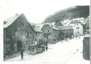 Schwarzweißfotografie. Diese Aufnahme zeigt die Schillergasse in Alt-Sayn um 1910. Im Vordergrund erkennt man die Bachmauer des Brexbaches (ehemalige Stadtmauer). Auf der Brexstraße und in der Schillergasse sind Erwachsene und Kinder unterwegs. Auch ein Bollerwagen ist zu sehen. Am rechten Bildrand ist das ehemalige Geschäftshaus von Georg Hünermann und im Hintergrund die Ruine der Burg-Sayn zu erkennen. Es handelt sich vermutlich um ein Reprint einer Fotografie im Historischen Archiv Krupp in Essen (HAK: WA 16 c 76.1).