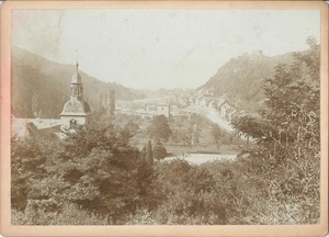 Schwarzweißfotografie 1890er Jahre aufgeklebt auf eine Pappe. Diese Aufnahme zeigt einen Blick auf Alt-Sayn. Am linken Bildrand ist der Kirchturm der Abteikirche zu erkennen. In der Bildmitte verläuft die Abteistraße und am rechten Bildrand ist der Burgberg mit der Burgruine sichtbar. Die Fotografie stammt vermutlich von Oskar Kroeber, Direktor der Sayner Hütte und Vorsitzender des Sayner Verschönerungsvereins aus der Zeit um 1899. Sie wurde in dem 1899 vom Verschönerungsverein herausgegebenen zweiten "Führer für die Umgebung von Sayn" veröffentlicht.