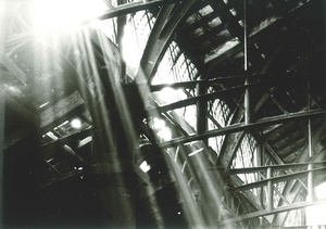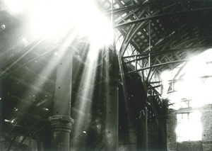 Schwarzweißfotografie aus dem Nachlass von Josef Röder, dem Bodendenkmalpfleger und ehemaligen Direktor des Landesmuseums Koblenz. Diese Aufnahme aus dem Jahr 1973 zeigt eine Innenansicht der von Carl Ludwig Althans im Jahre 1830 erbauten Gießhalle der Sayner Hütte in Bendorf-Sayn nach ihrer Schließung im Dezember 1926. Der Fotograf blickt vom Hochofenbereich in die Gießhalle Richtung Westfassade, die zu dieser Zeit zugemauert ist und einige Fensteröffnungen zeigt. Sehr gut zu erkennen sind die gusseisernen Säulen und Bögen zwischen Mittel- und Seitenschiff der Gießhalle. Die historische Gießhalle, der am 27. August 2010 der Titel „Historisches Wahrzeichen der Ingenieurbaukunst“ verliehen wurde, gilt als erster Industriebau mit einer tragenden Gusseisenkonstruktion. Die ursprüngliche Halle mit 24 × 29 Metern und sechs Jochen wurde im Jahr 1844 um vier Joche auf 43,30 Meter vergrößert. Das gesamte Tragwerk besteht aus Gusseisen. Die 6,5 Meter hohen Säulen mit dorischen Kapitellen tragen die gusseisernen Längs- und Querbinder und die in der Querrichtung verlaufenden Korbbogenbinder tragen die Dächer der Seitenschiffe. Durch die gesamte Halle verläuft eine Transportebene, die an den Bindern der Obergaden aufgehängt ist. Über Treppen war sie mit der Gießebene und dem Hochofen verbunden. In der Apsis der Halle stand der Hochofen, der vom Hang aus beschickt wurde sowie zwei Flammöfen. Der Rauchabzug geschah durch die verglasten Obergaden im Mittelschiff. Die Gussteile konnten mit acht an den Rundsäulen angebrachten Auslegerkränen in die Seitenschiffe transportiert werden. Den vorderen Abschluss der Gießhalle bildete eine Glaswand mit Eisenrippen im Mittelschiff und Spitzbögen in den Seitenschiffen. 1844 waren neben den vier preußischen Hüttenbeamten noch rund 170 Arbeiter beschäftigt. Die Hütte bestand aus zwei Hochöfen, je vier Flamm- und Kupolöfen, drei Zylindergebläsen, einem Bohr-, Dreh- und Schleifwerk sowie verschiedenen Nebengebäuden. Alle Maschinen wurden durch Wasserkraft angetrieben. Nach der Stilllegung der Hütte begann ein stetiger Verfall der Industriegebäude, obwohl diese bereits 1929 durch die Rheinprovinz unter Denkmalschutz gestellt worden waren. Eine anstelle der ehemaligen Glasfassade vor die Gießhalle gebaute, gemauerte Halle wurde in dieser Zeit wieder abgebrochen. Nach dem Zweiten Weltkrieg schritt der Verfall so weit voran, dass um 1970 der Abbruch unausweichlich schien. Erste Schritte zur Erhaltung Gießhalle begannen 1976 durch den damaligen Eigentümer Heinrich Strüder. In den Jahren 1978–1979 konnte die Rekonstruktion der großen Westfront durchgeführt werden. Danach erfolgte in den 1980er Jahren die Sicherung der oberen und seitlichen Gebäudeteile. Nachdem die Hütte wieder in den Besitz der Stadt Bendorf übergegangen war, begann man 2012 mit Finanzmitteln von Stadt, Land und Bund eine groß angelegte Sanierung und Renovierung mit dem Ziel, das Industriedenkmal als Museum und als Veranstaltungssaal nutzen zu können. Trotz weiterer Renovierungen des Hochofentraktes, wird die Gießhalle bereits seit einigen Jahren kulturell genutzt. Am 28. April 2017 wurde das Besucherzentrum eröffnet und damit das Gelände für Besucher zugänglich, und seit März 2019 kann auch die neue Hochofeninszenierung besichtigt werden.