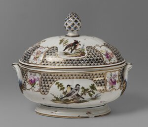 Ovale Suppenterrine mit Vogeldekor Eine ovale, große und bauchige Terrine mit Henkeln in vegetabilen Formen. Der Fuß ist mehrmals gestuft nach außen hin vorgezogen. Bemalt ist sie auf der Schulter mit einem Dreiecksmuster. Ausgeschmückt ist dieses, ebenso wie neben den Griffen , mit goldgeränderten Kartuschen mit Blumengebinden. An den Langseiten je eine Gruppe von zwei Vögeln in einer Landschaft. Blaumarke: CT mit Krone. Der Deckel hat einen Griff in Form eines Pinienzapfens, mit gold- und blaufarbenen Details bemalt. Die Deckeloberfläche ist schwach gerillt. Der Deckel hat die gleiche Bemalung wie der Gefäßkörper: Dreiecksmuster, Blumenkartuschen, zwei mal zwei Vögel und – den Griffen zu – je ein Vogel. Ohne Marke