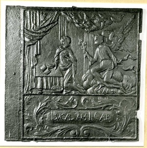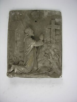 Schale rhombischer Grundform mit schräg aufsteigendem Rand. Im Spiegel Malerei in zarten, bunten Farben: der halb sitzende, halb liegende tote Adonis mit einer blutenden Wunde links am Oberkörper. Um seinen Unterleib ist ein roter Mantel gewunden, an den Sandalen sind gold-bronzene Schäfte und links neben ihm liegt ein Speer. Über sein rechtes Knie lehnt sich der weinende Amor, der eine blauen Schleife um den Arm trägt. Von oben aus den Wolken beugt sich trauernd Venus hervor. Sie ist nur locker mit einem violettem Gewand bekleidet. Hinter ihr ragen zwei Schwäne aus den Wolken. Im Vordergrund ist Laub, rechts ein Felsstück und ein Baum, hinter dem ein schwarzgefleckter Hund hervorschaut. Marken: Unterglasurblau: Rhombus mit Punkt. CT mit Krone. Ritzzeichen H2.