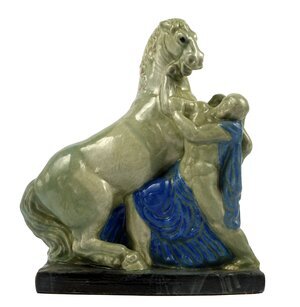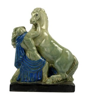 Paar von Rossbändigern. Jeweils ein Mann, der versucht ein sich aufbäumendes Pferd an einem, nicht vorhandenen, Halfter zu bändigen. Dabei sind die Köpfe der Pferde halb nach vorn gedreht. Die Männer sind nackt bis auf einen Umhang, der vom Hals über den Rücken und über die vorgestellten Beine fällt. Der eine Mann blickt nach vorn unten, der andere Mann nach oben. Männer und Pferde sind hellgrün glasiert, die Umhänge blau, der rechteckige Sockel ist schwärzlich gefleckt. Signaturen an der hinteren Kante der Sockel : B.Hoetger.