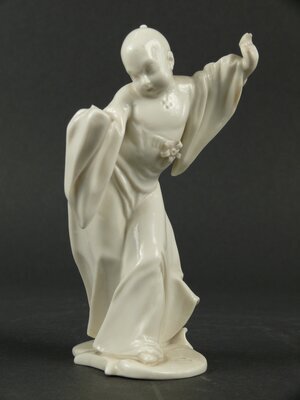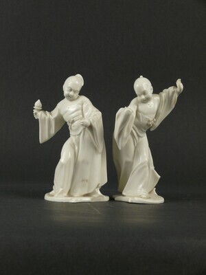 Zwei Neuformungen neuerer Zeit aus der Franz Anton Bustelli-Serie (12.4.1723 - 18.4.1763) „Chinesenknaben“ die etwa 1760 entworfen wurden. Beide Chinesen mit langen, hochgegürteten Gewändern und langen, weiten Ärmeln. Ihre Frisur besteht aus einem kahlen Kopf mit einem kleinen Zopf. Der eine stellt das rechte Bein vor, der andere das Linke. Der eine blickt nach links unten, der andere nach rechts unten. Einer hält außerdem in der rechten eine kleine Fackel. Der Sockel ist flach mit Rocaillen. Blindstempel: Weckenschild, bei beiden auf und unter dem Sockel; dazu unter Sockel bei einem 388 und 12, bei dem anderen 287 und 12