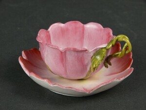 Mokkatasse in Blumenform mit Unterteller. Der Henkel ist in Form eines Blumenstängels stilisiert und grün angemalt. Die Tasse hat die Form einer rosa Tulpe. Der Unterteller ist ebenso blütenförmig und rosa. Hergestellt von der Porzellanfabrik Dornheim, Koch & Fischer in Gräfenroda.